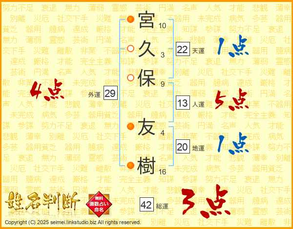 宮(10画)久(3画)保(9画) 友(4画)樹(16画)