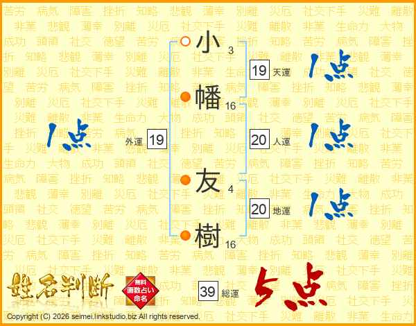 小(3画)幡(16画) 友(4画)樹(16画)