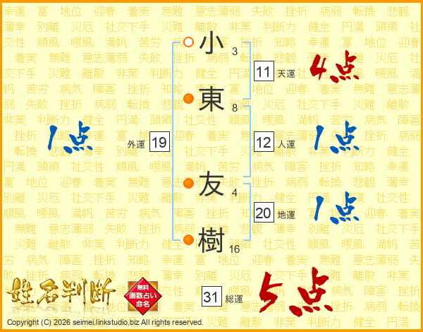 生活面を象徴する運勢です。外部から受ける影響力を表し、結婚運、家庭運や職場、環境への順応性を表します。総運から人運を引いた画数。姓や名が1文字の場合を除く。