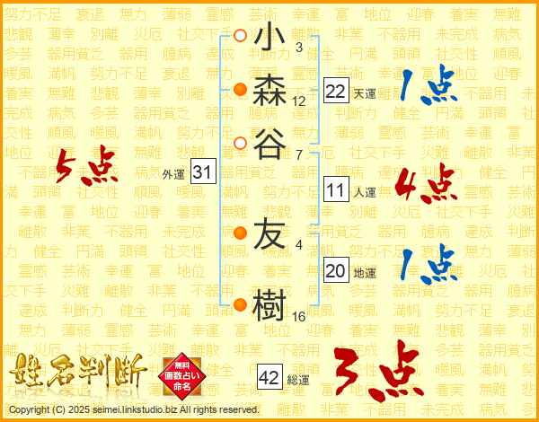 小(3画)森(12画)谷(7画) 友(4画)樹(16画)