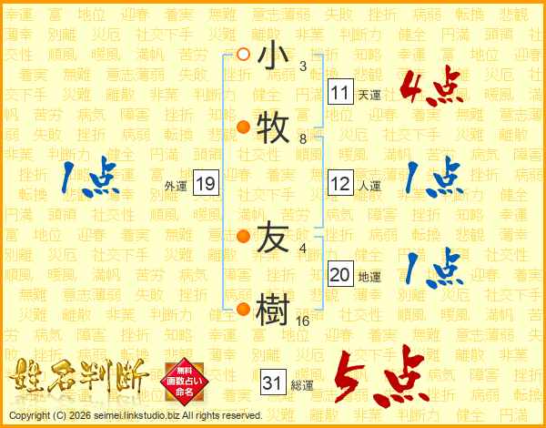 小牧友樹さんの総運は31画の5点!