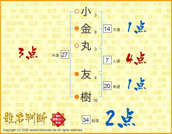 小(3画)金(8画)丸(3画) 友(4画)樹(16画)