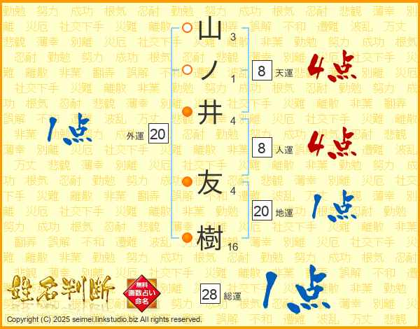 山(3画)ノ(1画)井(4画) 友(4画)樹(16画)