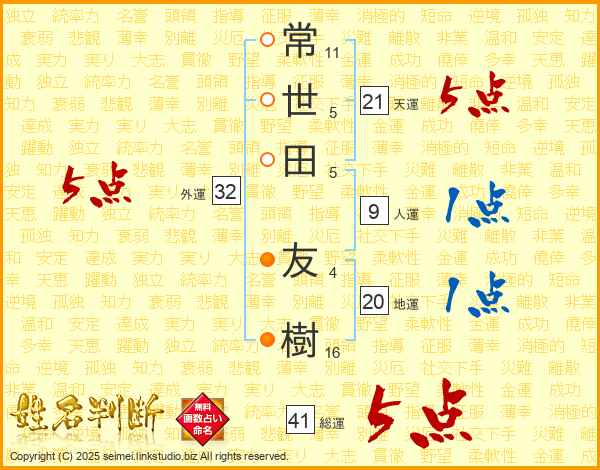 常世田友樹さんの総運は41画の5点!