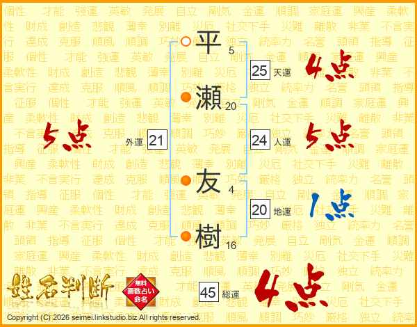 平瀬友樹さんの総運は45画の4点!
