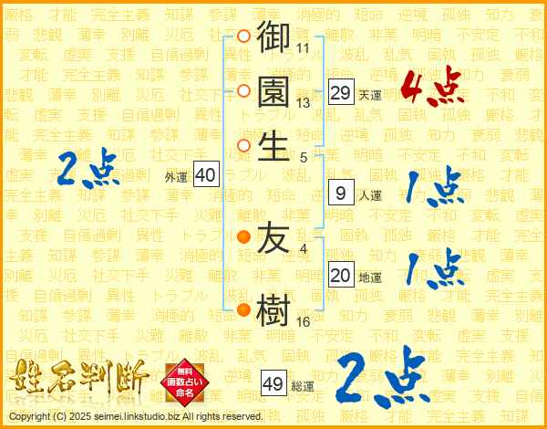 御(11画)園(13画)生(5画) 友(4画)樹(16画)