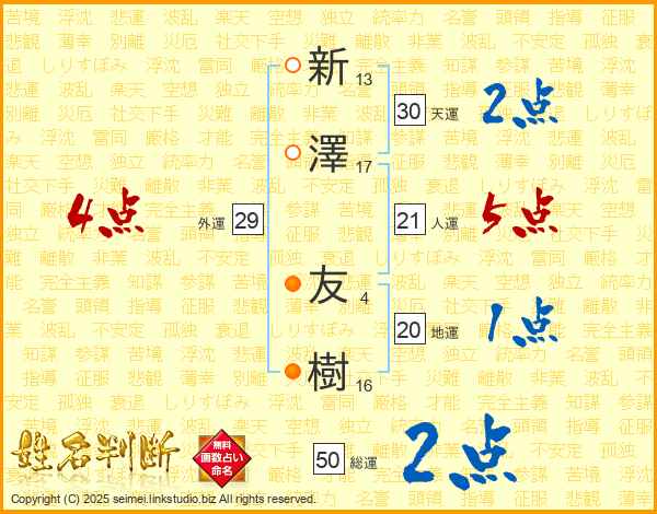 生活面を象徴する運勢です。外部から受ける影響力を表し、結婚運、家庭運や職場、環境への順応性を表します。総運から人運を引いた画数。姓や名が1文字の場合を除く。