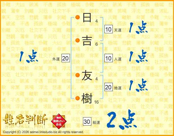 生活面を象徴する運勢です。外部から受ける影響力を表し、結婚運、家庭運や職場、環境への順応性を表します。総運から人運を引いた画数。姓や名が1文字の場合を除く。