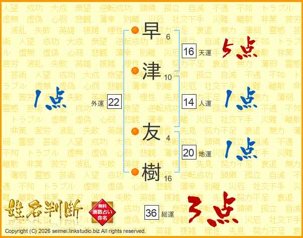 早(6画)津(10画) 友(4画)樹(16画)