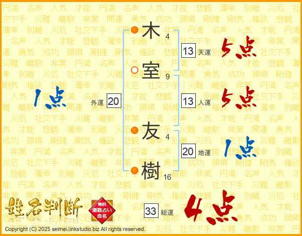 生活面を象徴する運勢です。外部から受ける影響力を表し、結婚運、家庭運や職場、環境への順応性を表します。総運から人運を引いた画数。姓や名が1文字の場合を除く。