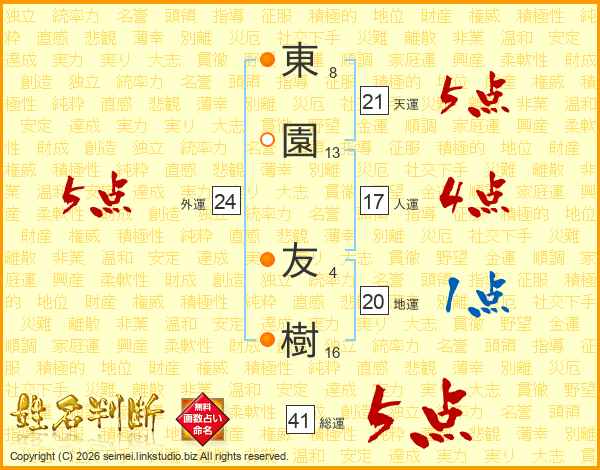 あなたの人生を表す1番重要な運勢です。生涯を通じて影響する総合運となり、主に50歳以降の晩年期に影響を及ぼします。苗字と名前の合計画数。