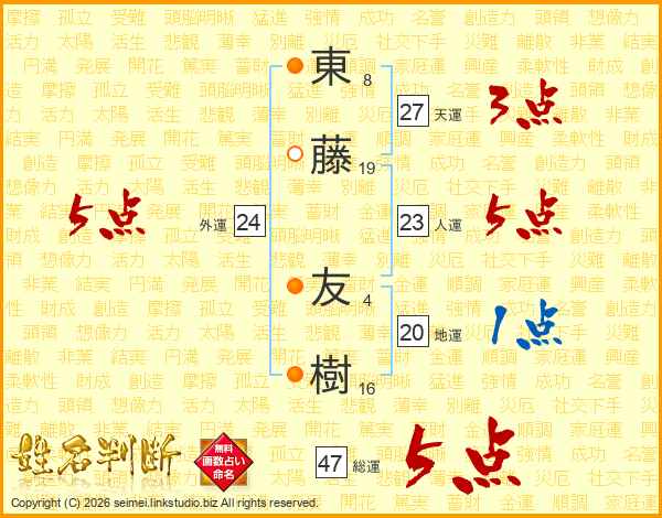東(8画)藤(19画) 友(4画)樹(16画)