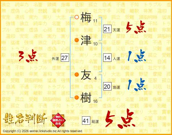 梅(11画)津(10画) 友(4画)樹(16画)
