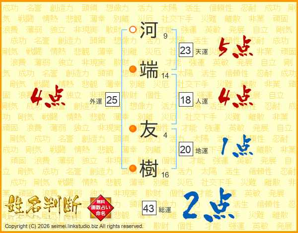 生活面を象徴する運勢です。外部から受ける影響力を表し、結婚運、家庭運や職場、環境への順応性を表します。総運から人運を引いた画数。姓や名が1文字の場合を除く。