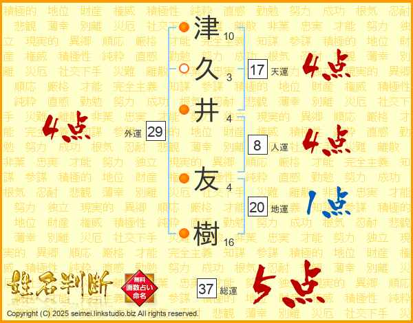 津(10画)久(3画)井(4画) 友(4画)樹(16画)