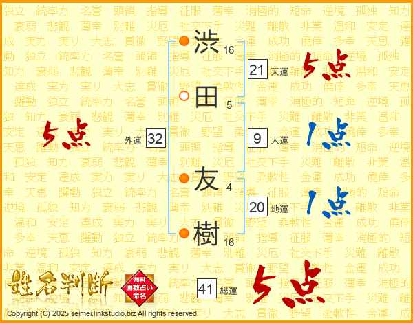 あなたの人生を表す1番重要な運勢です。生涯を通じて影響する総合運となり、主に50歳以降の晩年期に影響を及ぼします。苗字と名前の合計画数。
