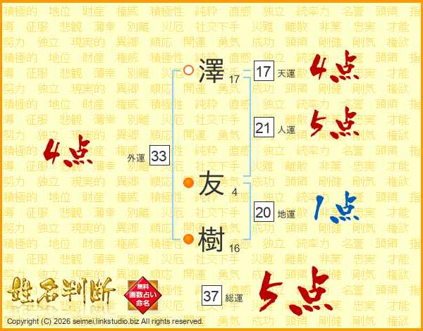 生活面を象徴する運勢です。外部から受ける影響力を表し、結婚運、家庭運や職場、環境への順応性を表します。総運から人運を引いた画数。姓や名が1文字の場合を除く。