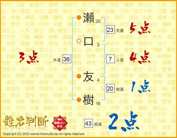 瀬(20画)口(3画) 友(4画)樹(16画)