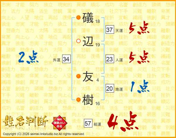 礒(18画)辺(19画) 友(4画)樹(16画)