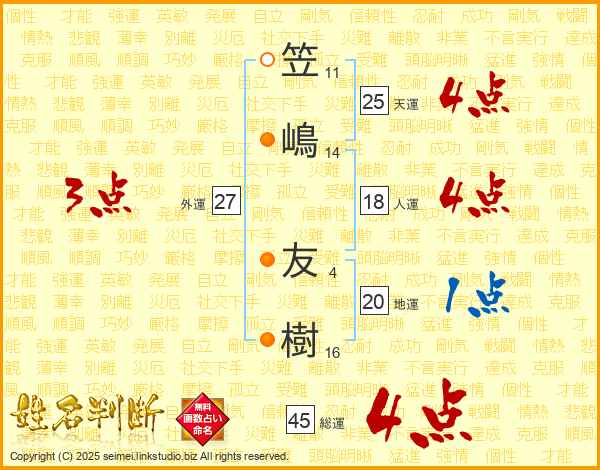 笠嶋友樹さんの総運は45画の4点!