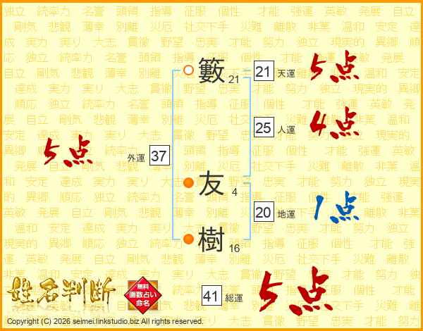 籔友樹さんの総運は41画の5点!