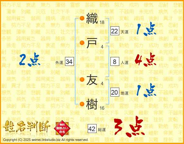 あなたの人生を表す1番重要な運勢です。生涯を通じて影響する総合運となり、主に50歳以降の晩年期に影響を及ぼします。苗字と名前の合計画数。