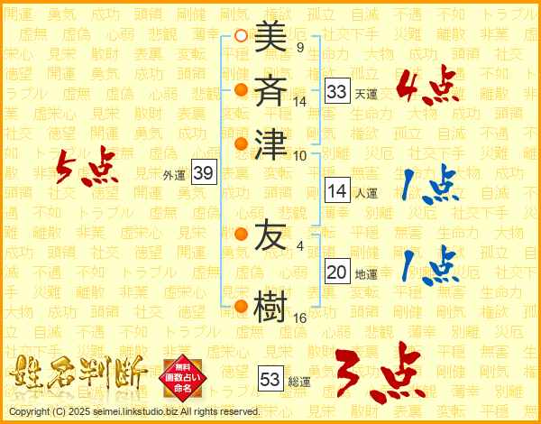 美(9画)斉(14画)津(10画) 友(4画)樹(16画)