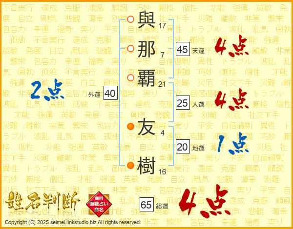 與(17画)那(7画)覇(21画) 友(4画)樹(16画)
