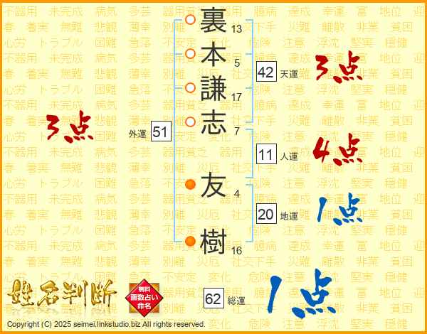 裏本謙志友樹さんの人運は11画の4点!