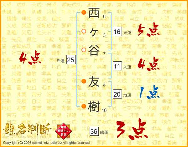 西(6画)ヶ(3画)谷(7画) 友(4画)樹(16画)