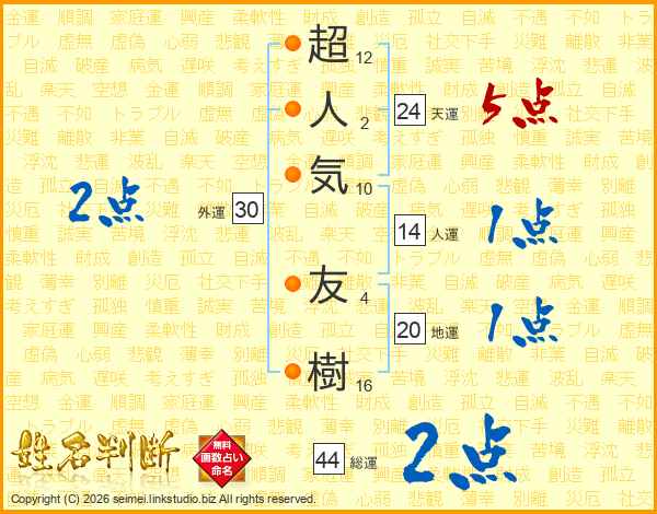 超(12画)人(2画)気(10画) 友(4画)樹(16画)