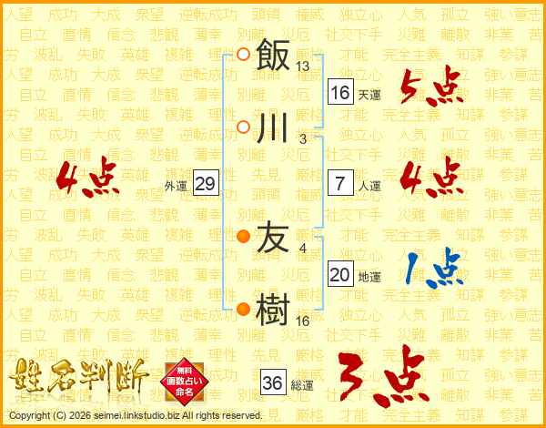 あなたの人生を表す1番重要な運勢です。生涯を通じて影響する総合運となり、主に50歳以降の晩年期に影響を及ぼします。苗字と名前の合計画数。