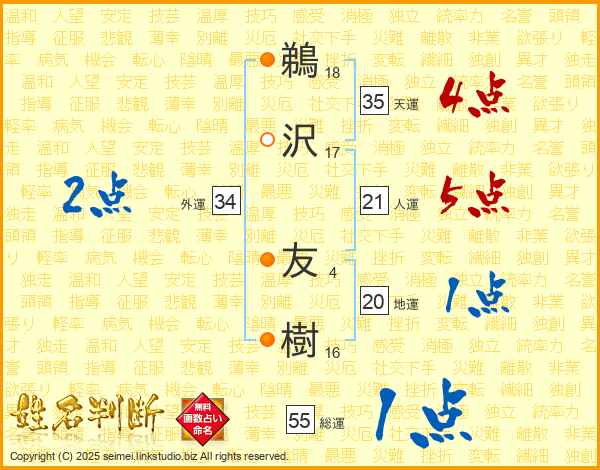 鵜(18画)沢(17画) 友(4画)樹(16画)