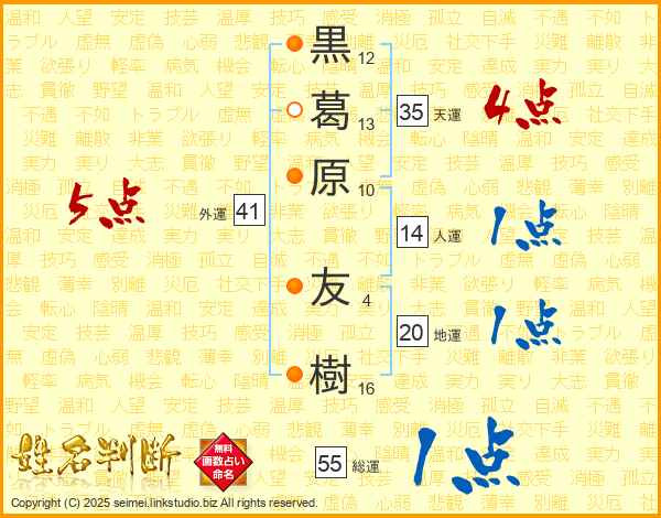 黒(12画)葛(13画)原(10画) 友(4画)樹(16画)