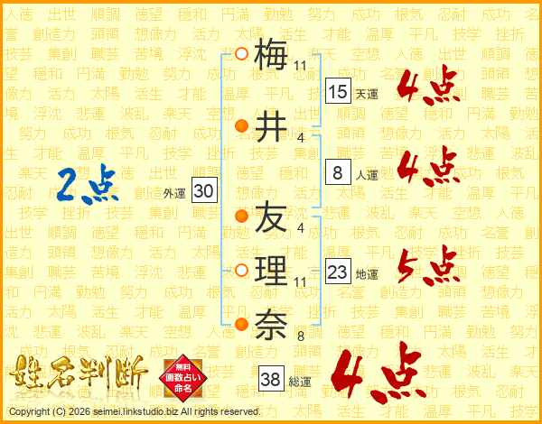 梅(11画)井(4画) 友(4画)理(11画)奈(8画)