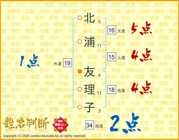 北(5画)浦(11画) 友(4画)理(11画)子(3画)