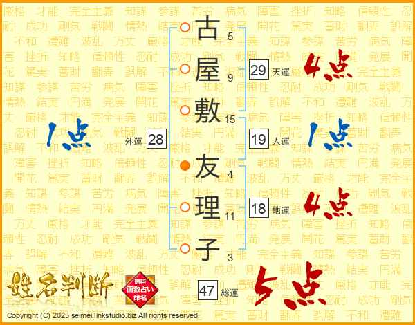 古(5画)屋(9画)敷(15画) 友(4画)理(11画)子(3画)