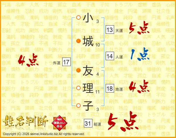 小(3画)城(10画) 友(4画)理(11画)子(3画)