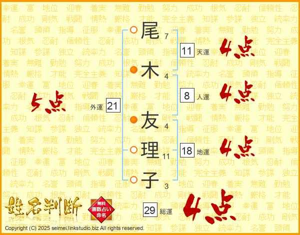 尾(7画)木(4画) 友(4画)理(11画)子(3画)