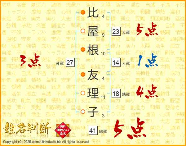 比(4画)屋(9画)根(10画) 友(4画)理(11画)子(3画)