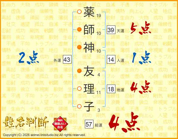 薬(19画)師(10画)神(10画) 友(4画)理(11画)子(3画)