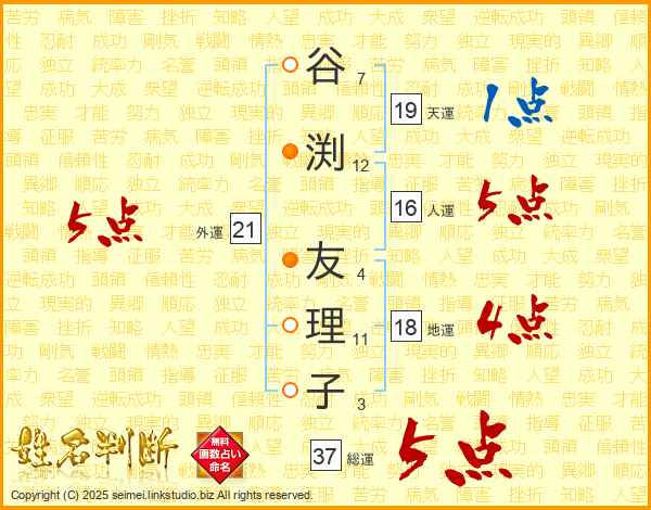 谷(7画)渕(12画) 友(4画)理(11画)子(3画)