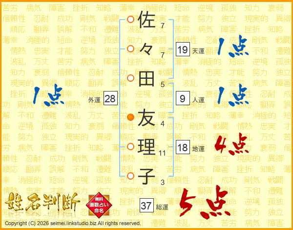 佐(7画)々(7画)田(5画) 友(4画)理(11画)子(3画)