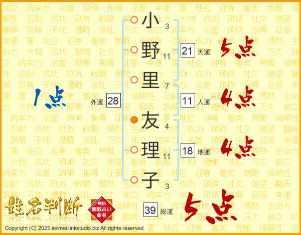小(3画)野(11画)里(7画) 友(4画)理(11画)子(3画)