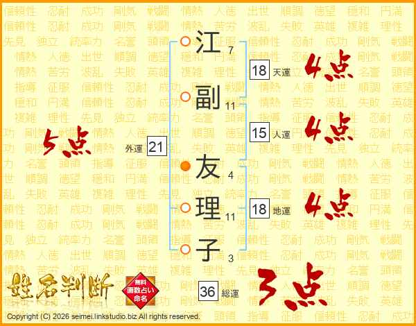 生活面を象徴する運勢です。外部から受ける影響力を表し、結婚運、家庭運や職場、環境への順応性を表します。総運から人運を引いた画数。姓や名が1文字の場合を除く。