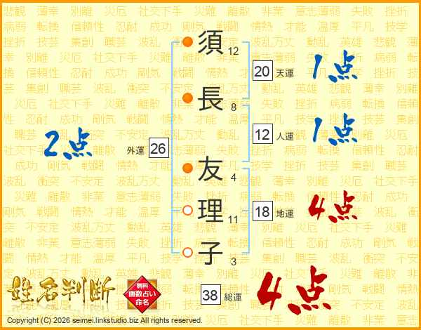 須(12画)長(8画) 友(4画)理(11画)子(3画)