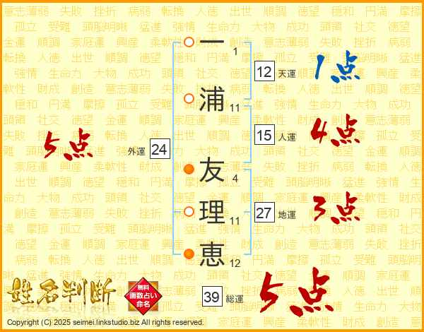 一(1画)浦(11画) 友(4画)理(11画)恵(12画)
