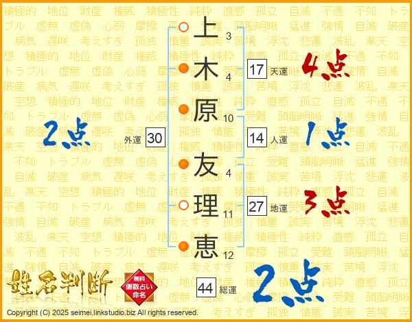 上木原友理恵さんの総運は44画の2点!