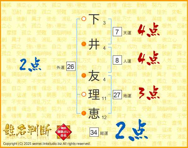 下(3画)井(4画) 友(4画)理(11画)恵(12画)