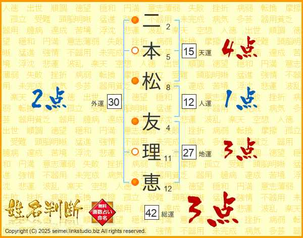 二(2画)本(5画)松(8画) 友(4画)理(11画)恵(12画)
